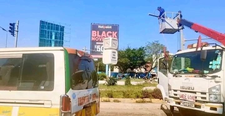 On a bright morning, residents gathered near the busy Kondele-Kisumu CBD corridor as trucks delivered steel poles, signal heads, and the latest traffic-control equipment. Workers in blue overalls climbed onto raised platforms, drilling and securing the tall metal structures. Curious onlookers stopped to watch, including schoolchildren with their backpacks and taxi drivers leaning on their vehicles, nodding in approval.